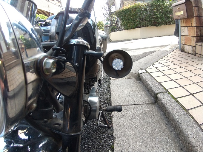 このキタコのウインカーリレーは、前後ともLED球に交換してしまうと正常動作する消費電力の範囲を下回ってしまうとの噂があるので、まずは前方だけLED球にしてみました。