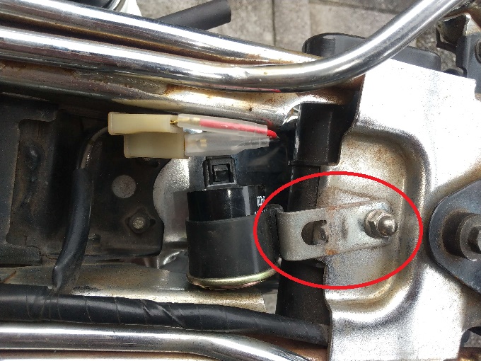 ウインカーリレーの設置場所も、上向きになっている既存のステーを上下反転させつつ少しズラせば、ドンピシャで収まりました!