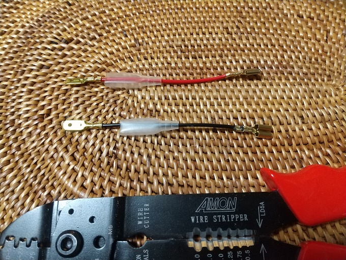 そのままポン付けとはいかないので、平型端子のオスとメスの配線コードを2本作って