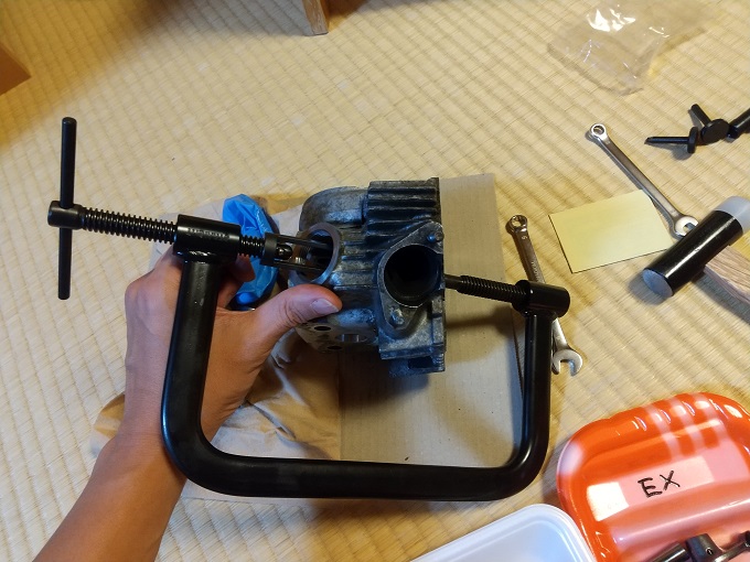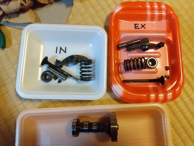 上記写真では、吸気側(「生たらこ」の容器)と、排気側(「かにかま」の容器)に外した部品を分けて管理しています!笑