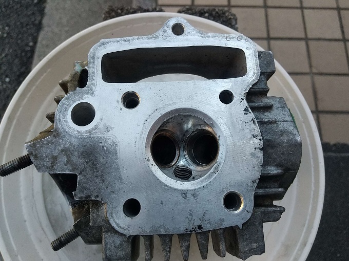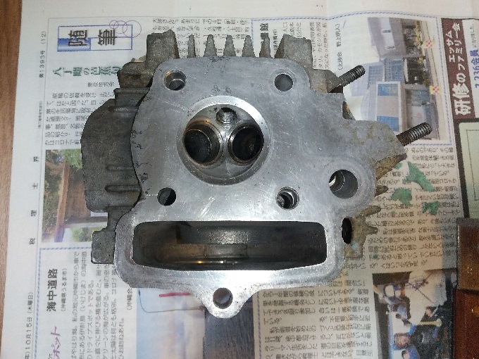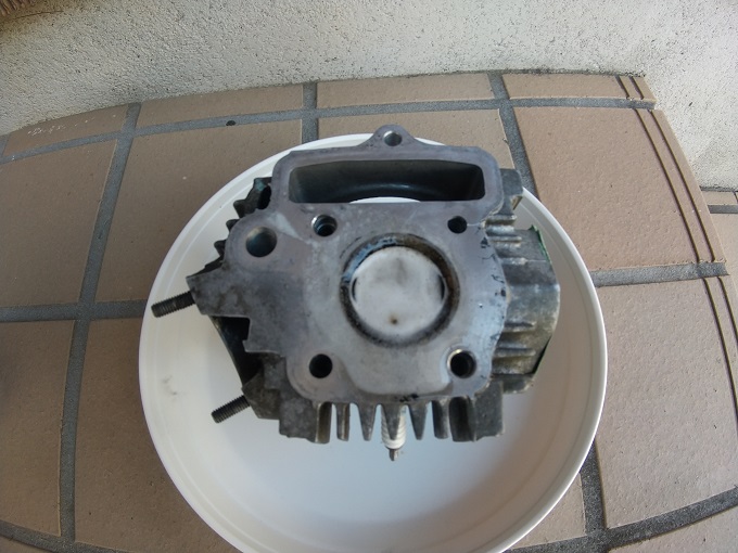 真っ黒な燃焼室は、バルブとプラグをセットして蓋をした状態でキャブクリーナーを吹き付けます。