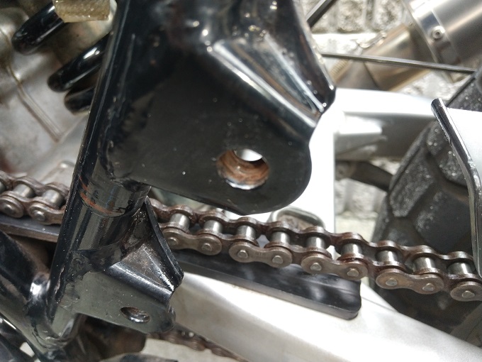 右側がヨシムラマフラー取付のためオフセットされているので、純正位置では左右のポジションが合いません。