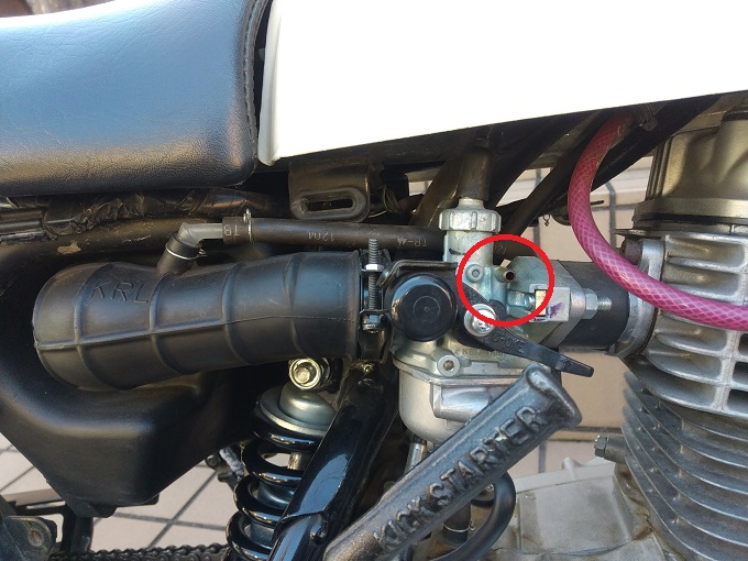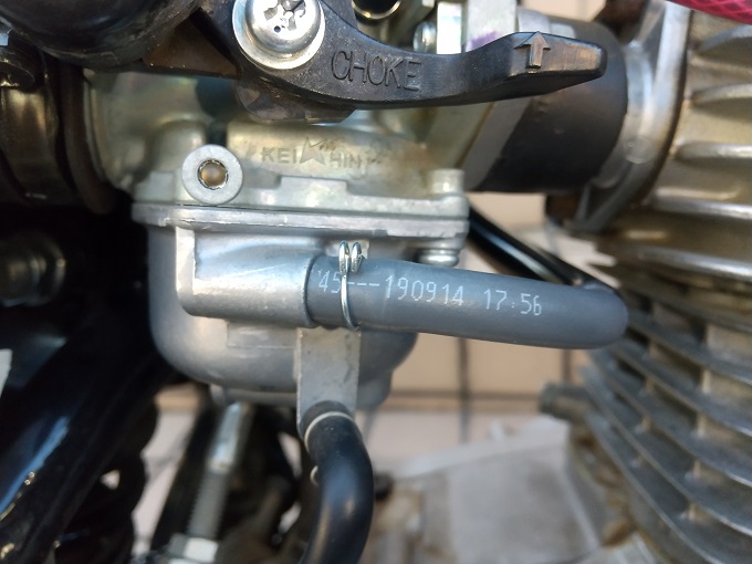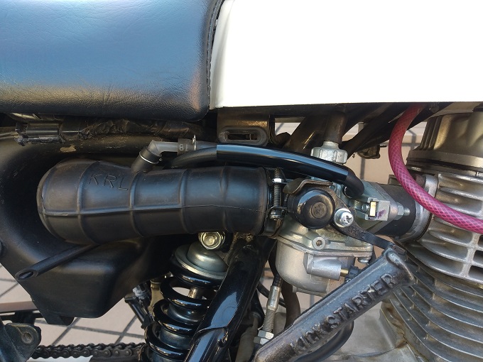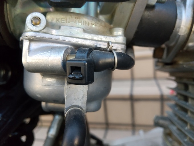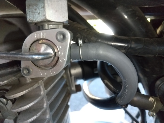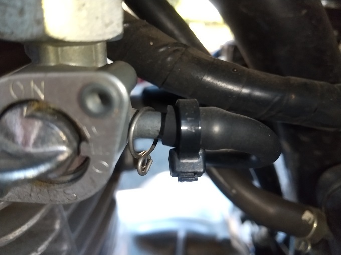 上記写真は、燃料タンクコックとキャブレターを結ぶガソリンホースのコック側を撮影したものですが、ホース長が足りていないので差し込みが甘く、強引にタイラップで固定しています。