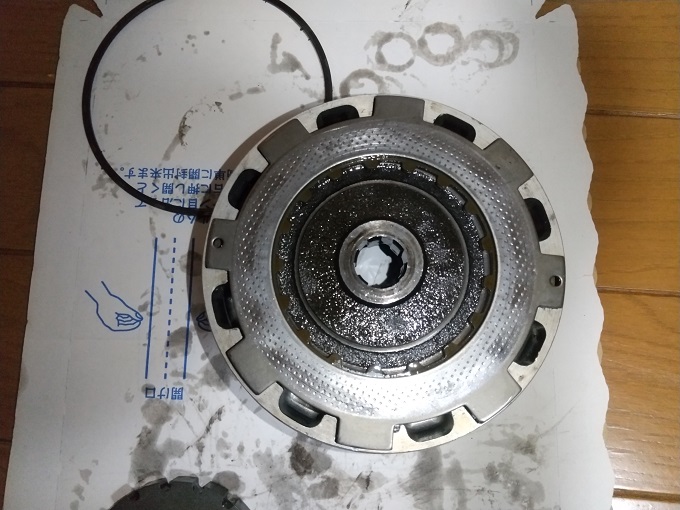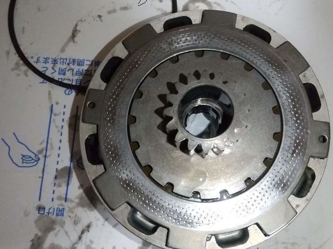 クラッチアウターに「スプリング」「ドライブプレート」「フリクションディスク」「プレート」の順にセットして、スプリングを圧縮させた状態で「セットリング」をはめる!という工程ですが、クラッチセンターが出ていないと、正常にクラッチが切れずに再度組み直しになってしまうので、プライマリードライブギアを置いてフリクションプレートの位置決めをしました。