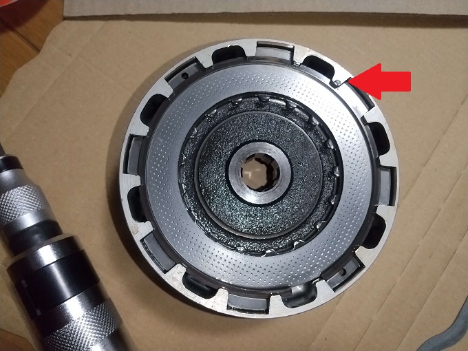 クラッチアウターに一部欠けている箇所があったので、その破片の可能性もあります。