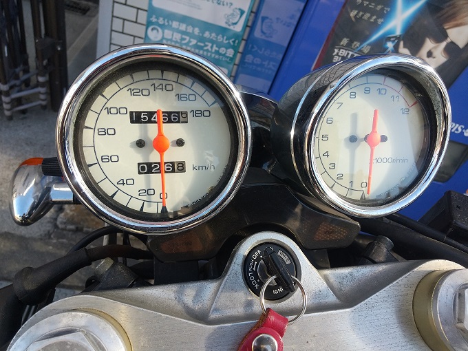 え~っと、事務所を出る前の走行距離が15,466kmで、バイクショップまでの距離は13-14kmくらいだと思うので、受検時の走行距離は15,480kmほどになりますかね。