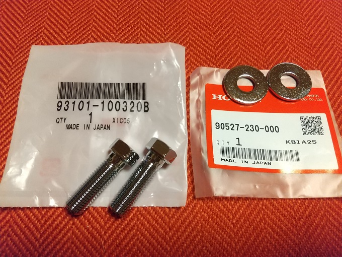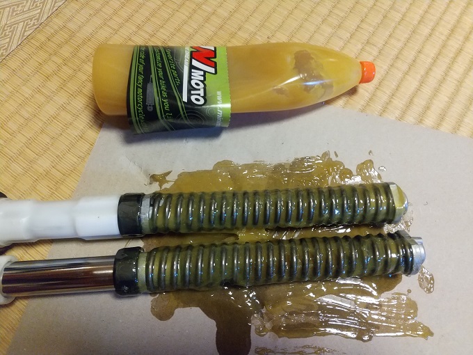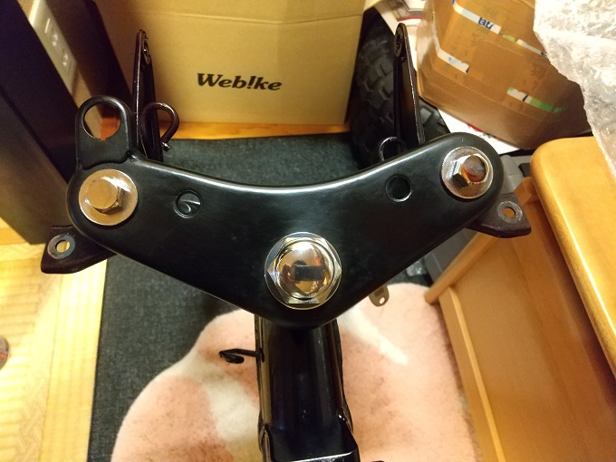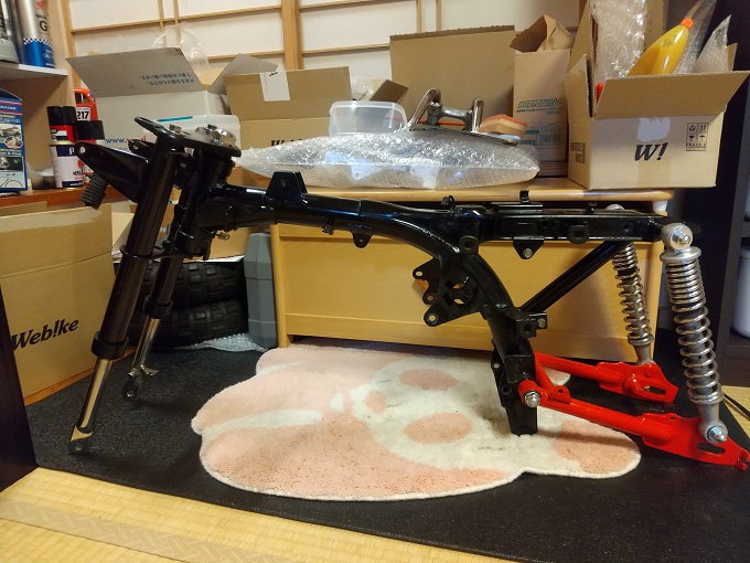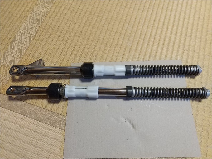 フロントフォークは、将来的に強化したりショート化する可能性もあるので、現時点ではストックしていた純正品を使います。