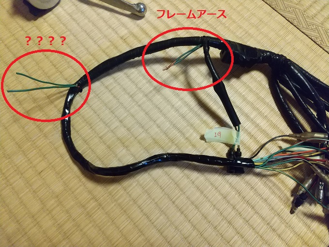 フレームアースの「緑」&「緑/白」配線以外に、途中でカットされている謎の「緑」配線が2本出ています。