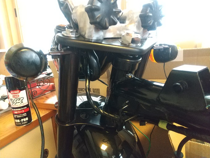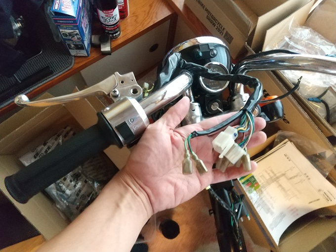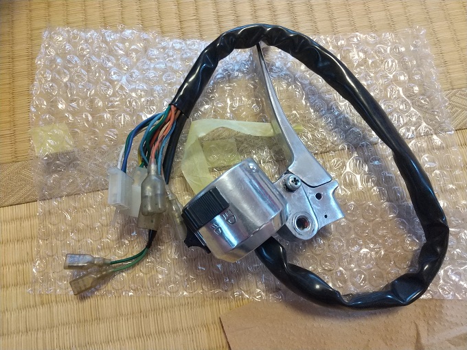 一方、左レバーはウインカー、ホーン、ライトスイッチがあるので、配線が少しヤヤこしそうです。