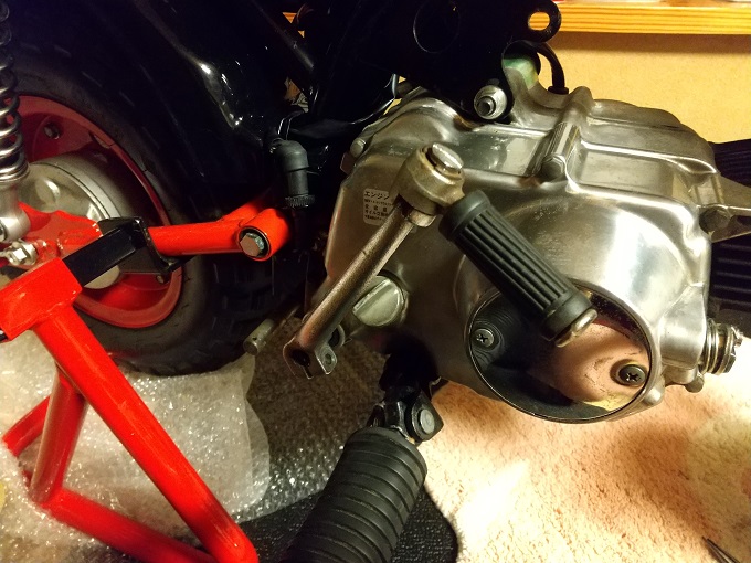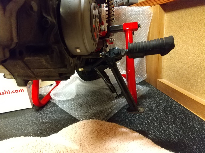 スタンドに載せていて通常位置ではキックペダルが降りないので、有り得ない角度で適当なキックペダル(車種不明)を仮付けしまして、