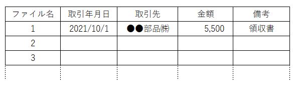 ちなみに、ファイル名を付けるのが面倒だなぁ…と感じる方は、ファイル名はシンプルに「1.pdf」「2.pdf」「3.pdf」としておいて、別途エクセルなどの管理シートで、そのファイル名と管理シート上の「取引年月日」「取引先」「取引金額」を紐づける形でも問題ありません。
