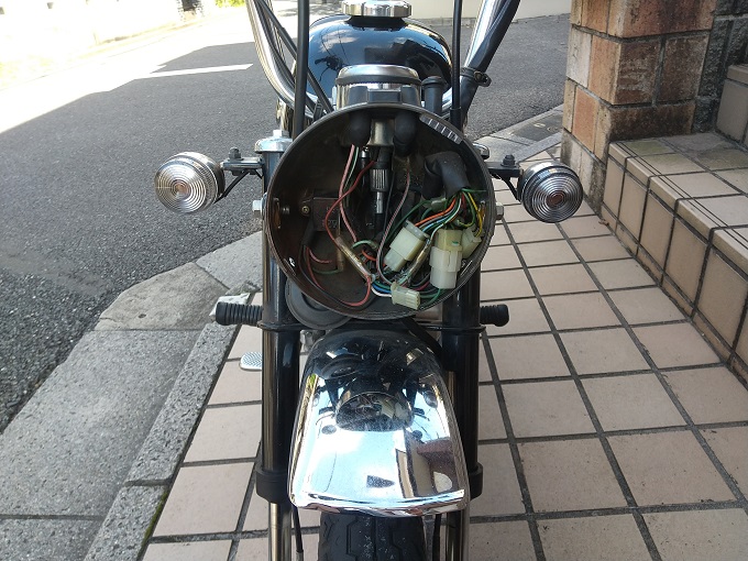 ヘッドライトレンズを外して、中の配線を確認していきます。