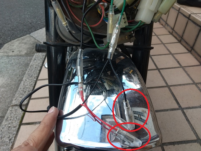 なお、このSP武川のテンプメーターの配線は、プラスとマイナスそれぞれに雌ギボシ端子の配線(赤丸)が余るので、他のメータなどが接続できるようになっています。