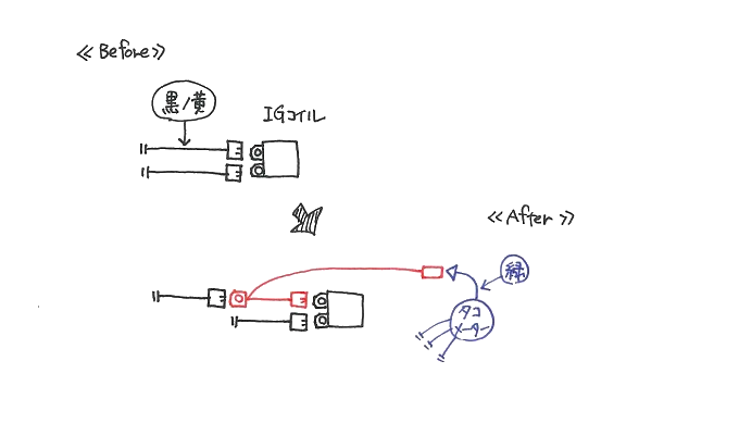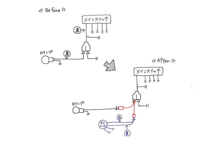メインスイッチとニュートラルランプの間の黒線に、サブ配線(図解の赤字)を入れています。