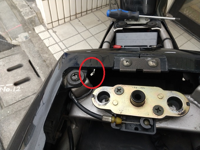 ここを通すしか無さそうなので、テールカウルの固定ボルトを少し緩めつつ、接続配線を強引に通していきます。