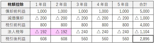 1年目に減価償却費1,000万円がドーンと計上されるので、一見すると節税効果大に見えますが、2年目以降の減価償却費が0円になるので、5年合計で見ると上記1の「優遇税制の適用なし」と同じ結果になります。