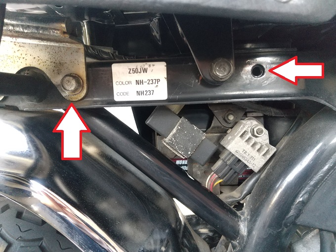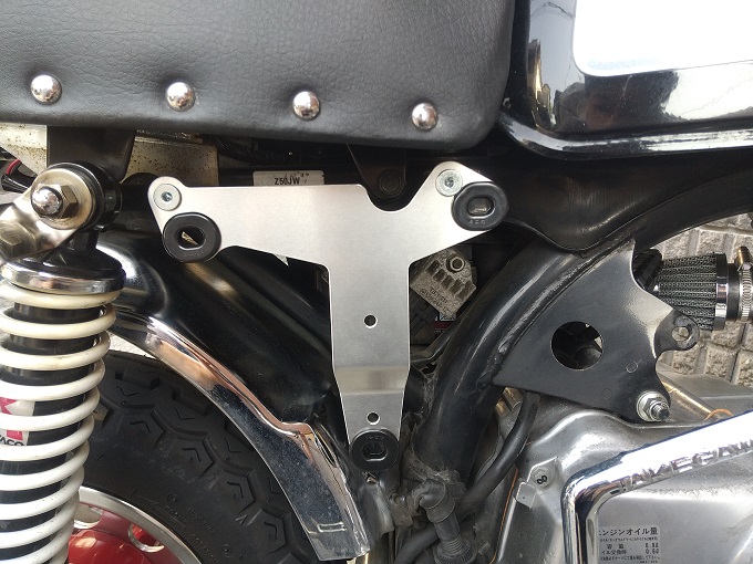 リアキャリアの取付ボルト穴と、純正マフラーの取付ボルト穴を使ってフレームに取り付けます。