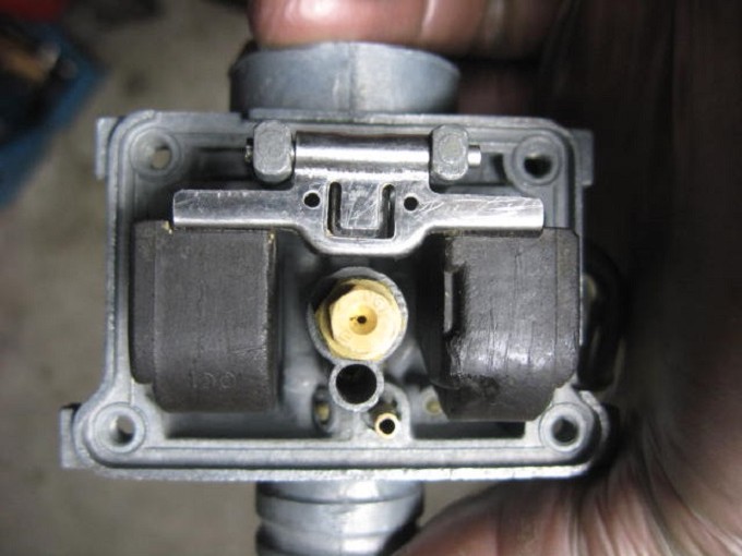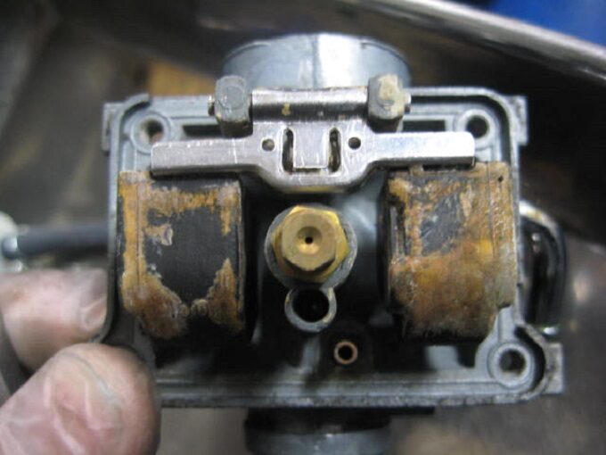 写真:清掃前のDT50キャブレター(フロートへの固着物が酷いです。)
