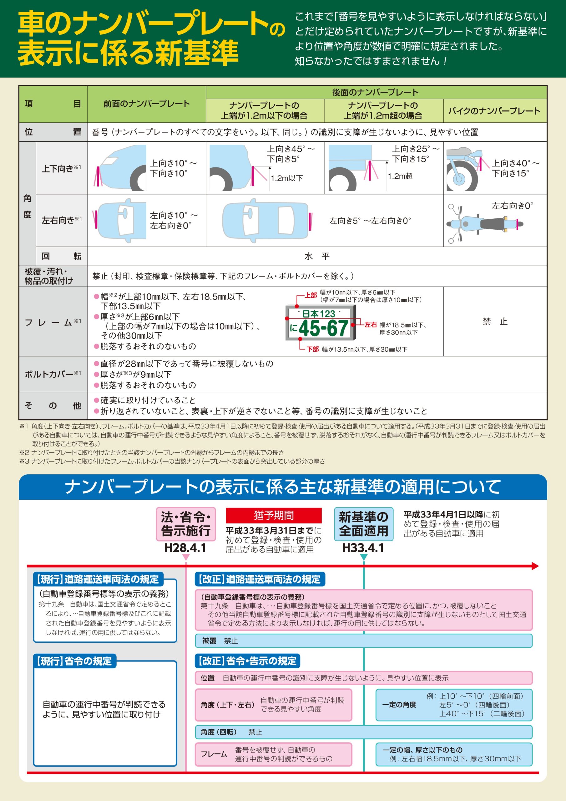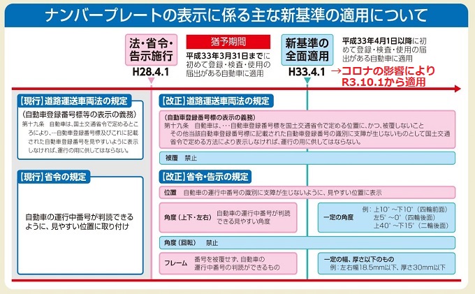 平成33年4月1日令和3年10月1日以降に初めて登録・検査・使用の届出がある自動車について適用する。(平成33年3月31日令和3年9月30日までに登録・検査・使用の届出がある自動車については、自動車の運行中番号が判読できるような見やすい角度によること、また、番号を被覆せず、脱落するおそれがなく、自動車の運行中番号が判読できるフレーム又はボルトカバーを取り付けることができる。)