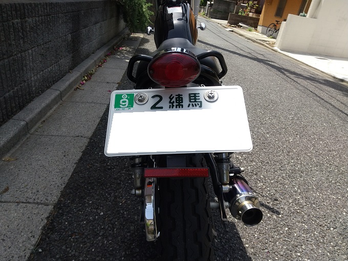 社外テールレンズへの変更に伴い、ナンバープレートがリアフェンダーに沿って上向きに付いているグラトラ君。