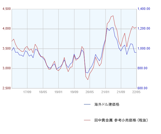 ひと昔前までは、プラチナは金より高価なイメージがありましたが、昨今の相場は金の方が圧倒的に高くなっています。