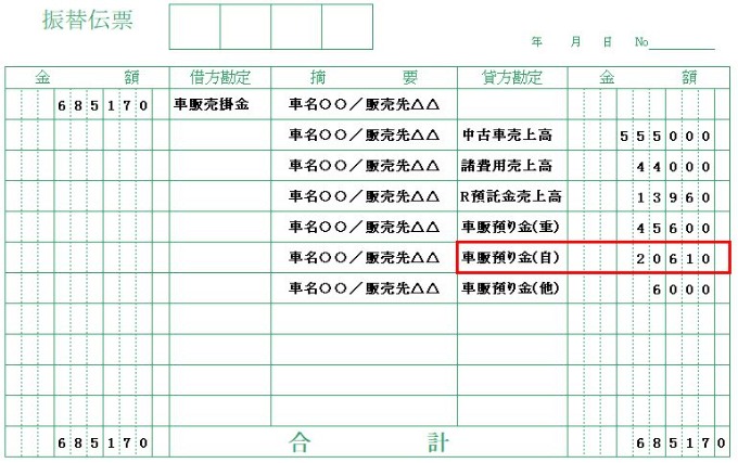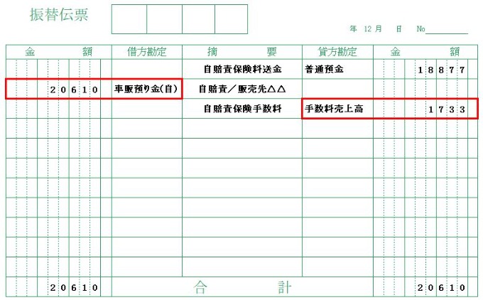 こうしてお客様から預かった自賠責保険料が『車販預り金(自)20,610円』として貸方(負債の部)に計上されます。