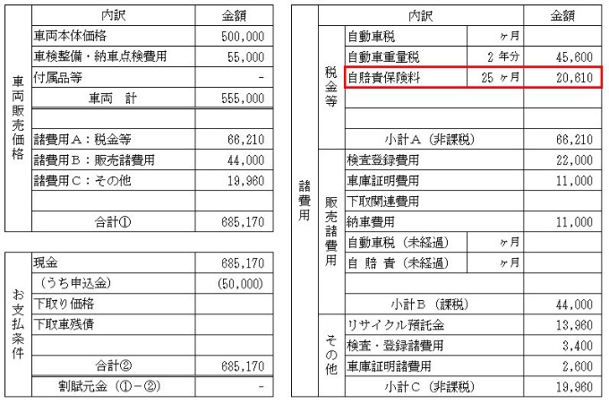 まず、自賠責保険料を預かった際の処理からご紹介しますが、実際にはキャッシュ(お金)を預かる訳ではなく、「車検整備請求書」や「自動車販売注文書」の法定費用の1項目としてお客様から自賠責保険料を預かる形となります。