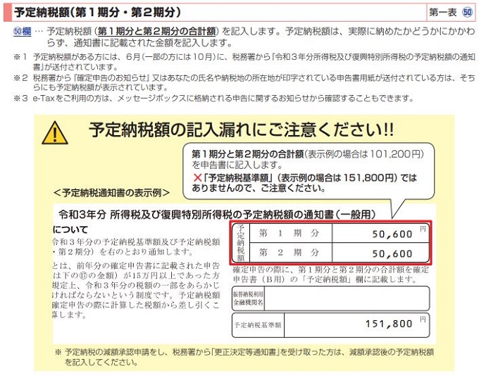 なお、申告書に記載する予定納税額は、第1期分と第2期分の合計額となります。