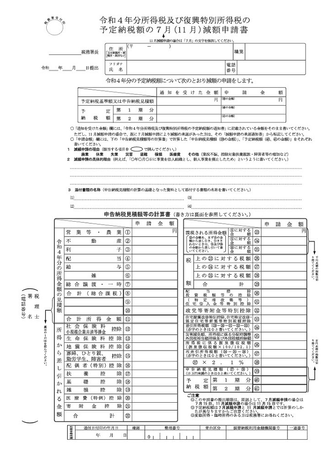そんな場合には「予定納税額の減額申請書」を期限内に提出することによって、予定納税額の減額を申請することができます。