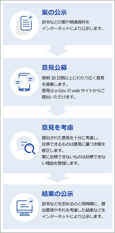 パブリック・コメントは、国の行政機関が政令や省令等を定めようとする際に、事前に、広く一般から意見を募り、その意見を考慮することにより、行政運営の公正さの確保と透明性の向上を図り、国民の権利利益の保護に役立てることを目的としています。