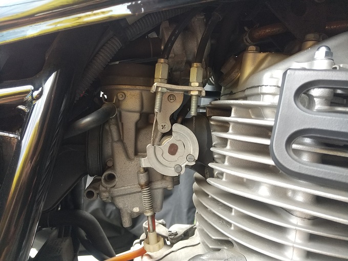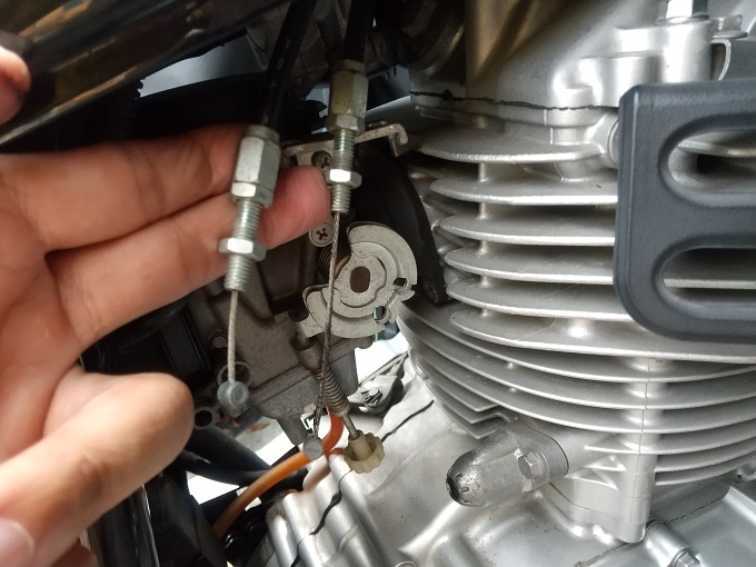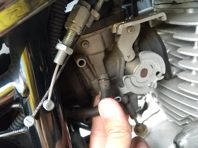 まずは車体からキャブレターを取り外すべく、2本のスロットルワイヤーを外します。