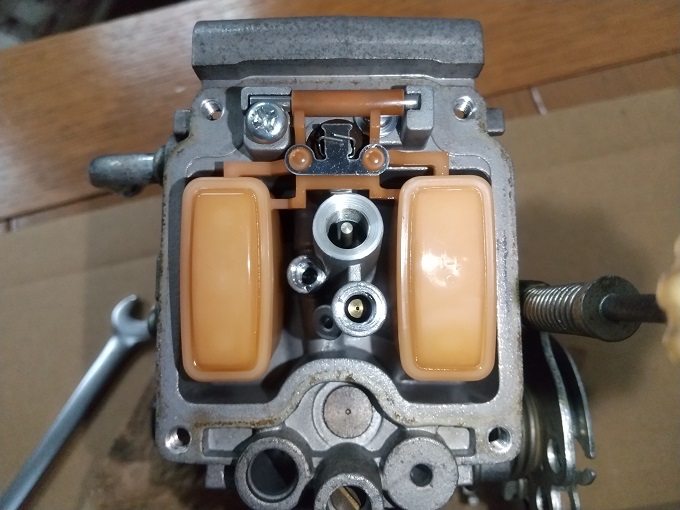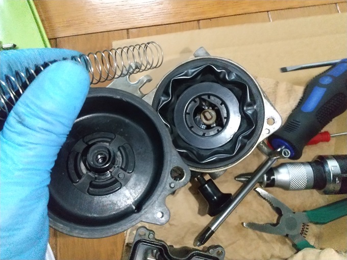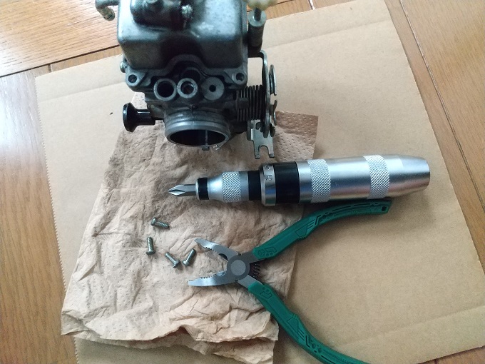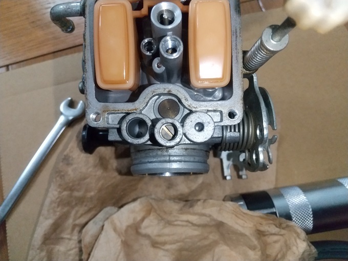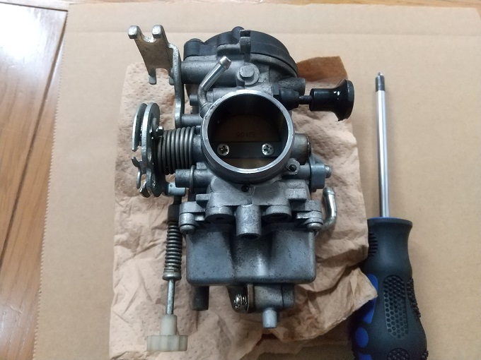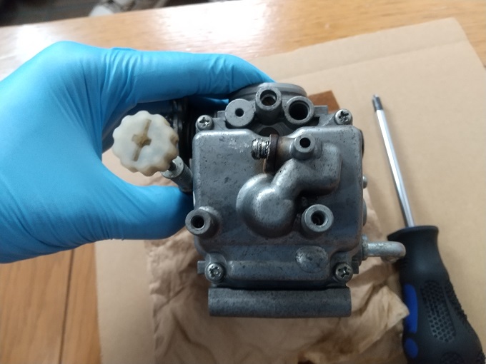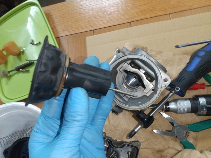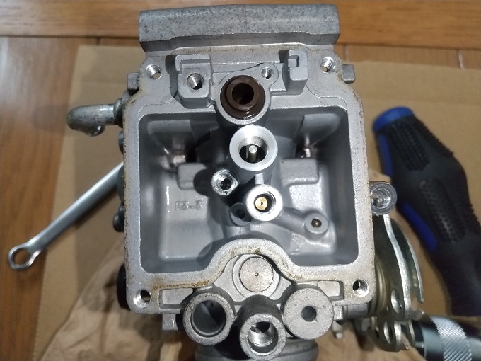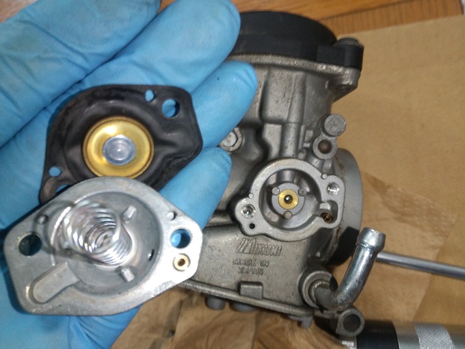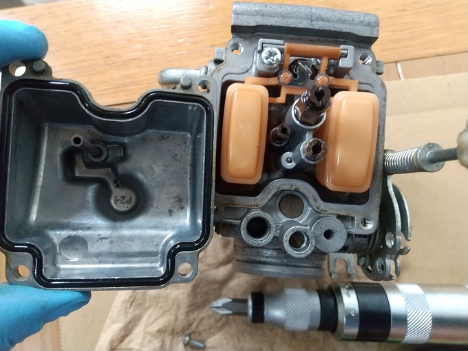 ここまでバラしたら、キャブレターを正立させて、トップのダイヤフラムカバーを外します。