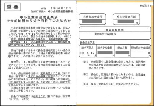前納申請期限は、払込みを希望する月の5日<土曜・日曜・祝日の場合は翌営業日、今年は12/5(月)>までに中小機構が受理できこと!となっておりますので、余裕をもって登録取扱機関に提出するようにしましょう。