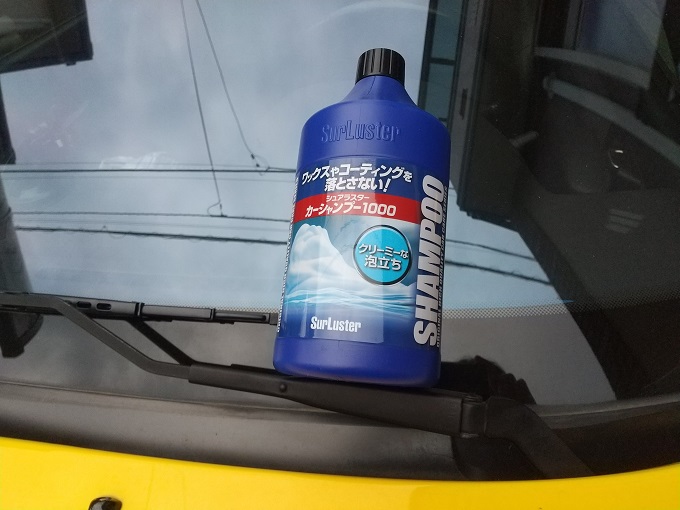 カーシャンプーは、コーティング車のウチの子と、コーティングしているか分からないヨソの子ともに使える「シュアラスター」のカーシャンプー1000。