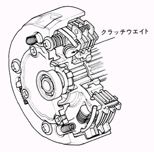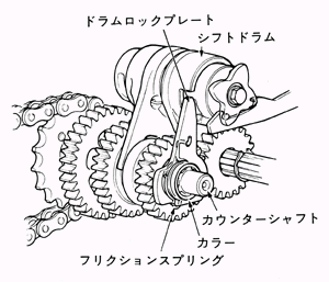 このチェンジ機構は、走行中はドラムロックプレートがシフトドラムの溝に当り、3速からニュートラルへのチェンジを防ぎます。