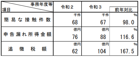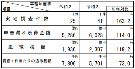 ・新型コロナウイルスの影響を受けつつも、調査件数、申告漏れ所得金額、追徴税額が増加