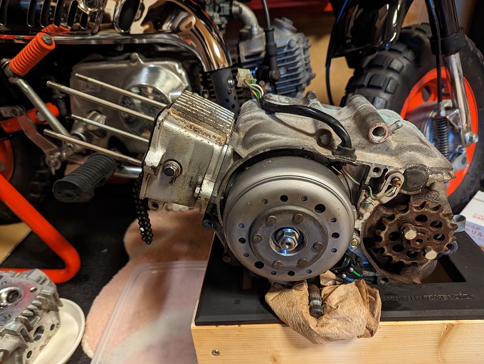 ヘッド回りのオーバーホール中のリトルカブ君のエンジン。