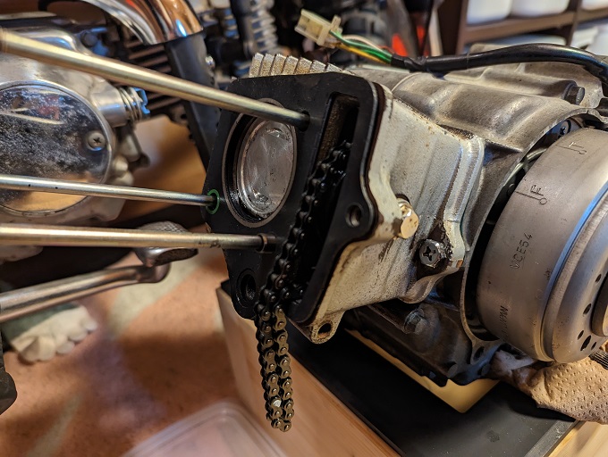 ちょっと写真では分かり辛いですが、カムチェーンスプロケットを外す前に、切り欠きのところでカムチェーンに印をつけておくと、組み上げる際にコマを合わせるのが超楽チンになります。
