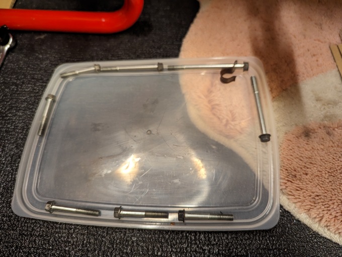 外したボルトはそれぞれ長さが異なるので、外した位置が分かるように並べて置いておきます。