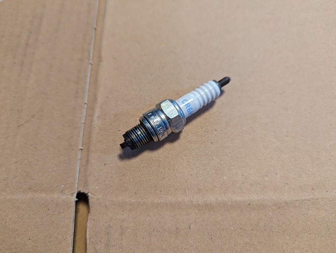 本来はスパークテスターなどを使用すると良いのだと思いますが、そのような便利な機器は持ち合わせていないので、古典的な方法(プラグのネジやカギ状に曲がった外側電極部分をシリンダーヘッドの金属部分に接触させてアースを取った状態で、キックペダルを降ろして(セルボタンを押して))点火確認を行っています。