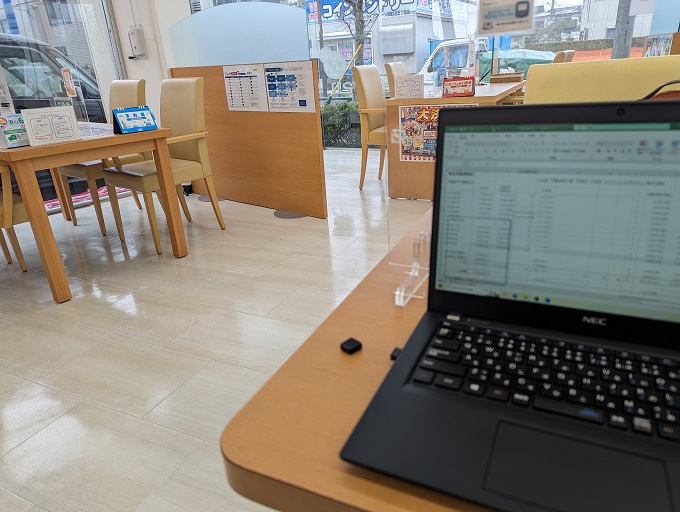 弊所では、ネット環境とパソコンが1台あれば、どこにいても事務所のサーバーとクラウドサーバーにアクセスして仕事を進めることができるので、新車の商談をされている方の隣で、お仕事させて頂きました(笑)