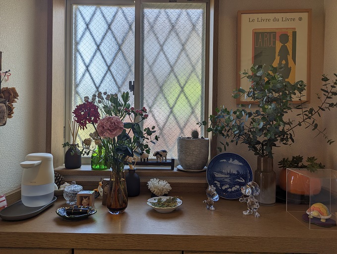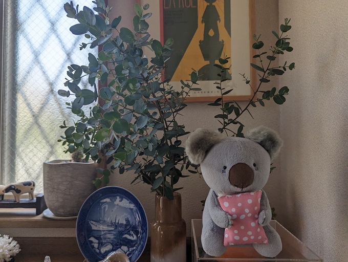 玄関には、お花とユーカリが飾られています。