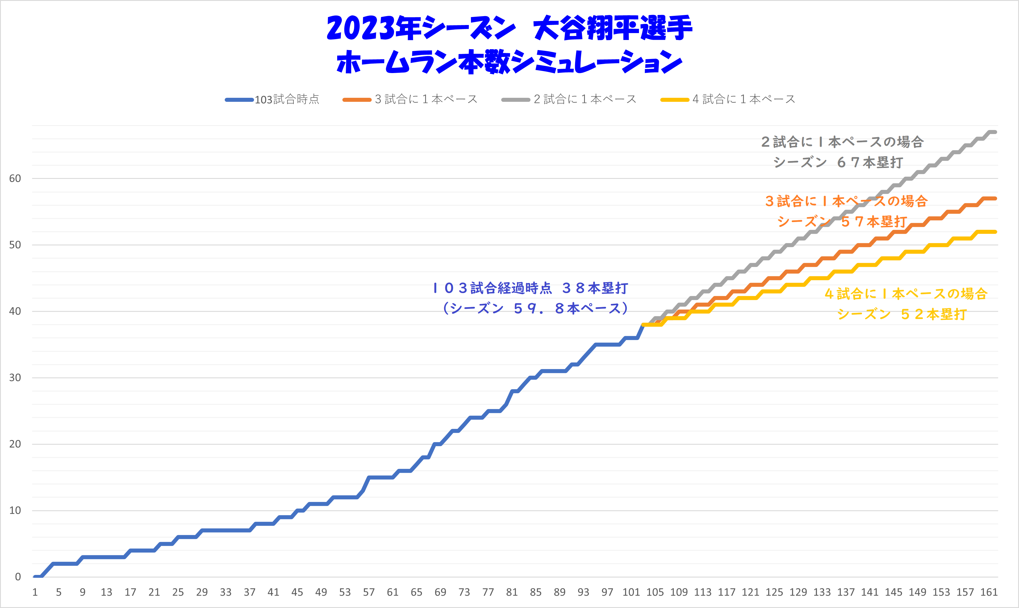 (現在38本 ÷ 消化103試合) × シーズン162試合 ≒ 59.8本ペース