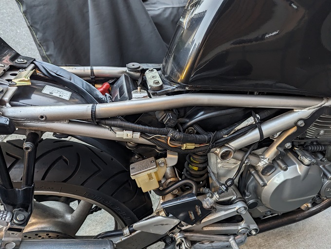 ちょっと狭いですが、スターターリレー回りの配線や端子の接触などを確認していきます。