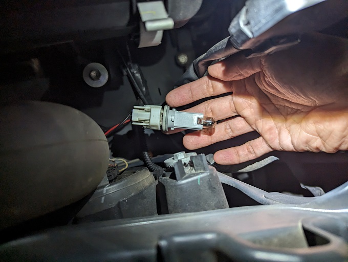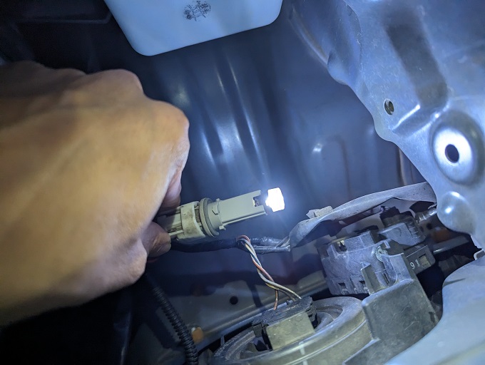 ランプは差し替えるだけですが、LEDバルブはプラスとマイナスの極性があるので、点灯確認をしてから組み戻します。