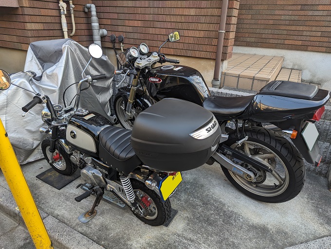 重心が高くなり、特にバイクカバーをかけた状態だと横風を受ける面積が大きくなってしまったので、先日の風雨で隣のグース350君に倒れ掛かっていました。