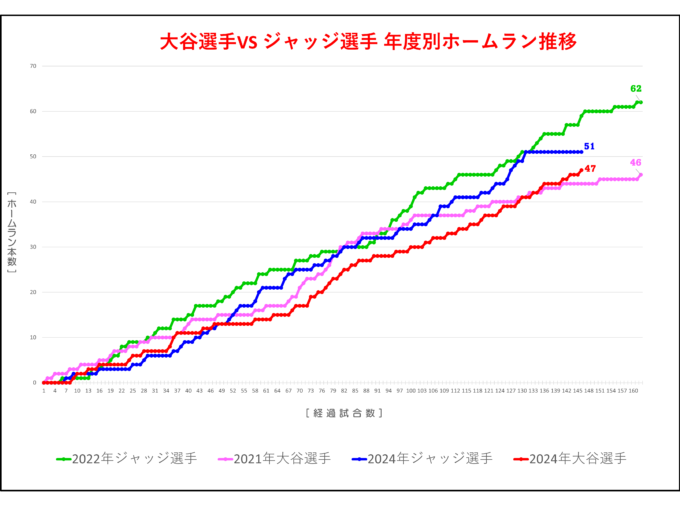 【最新】大谷選手とジャッジ選手の2024年ホームランペースをグラフ化して比較(ジャッジ選手は打撃不振?)