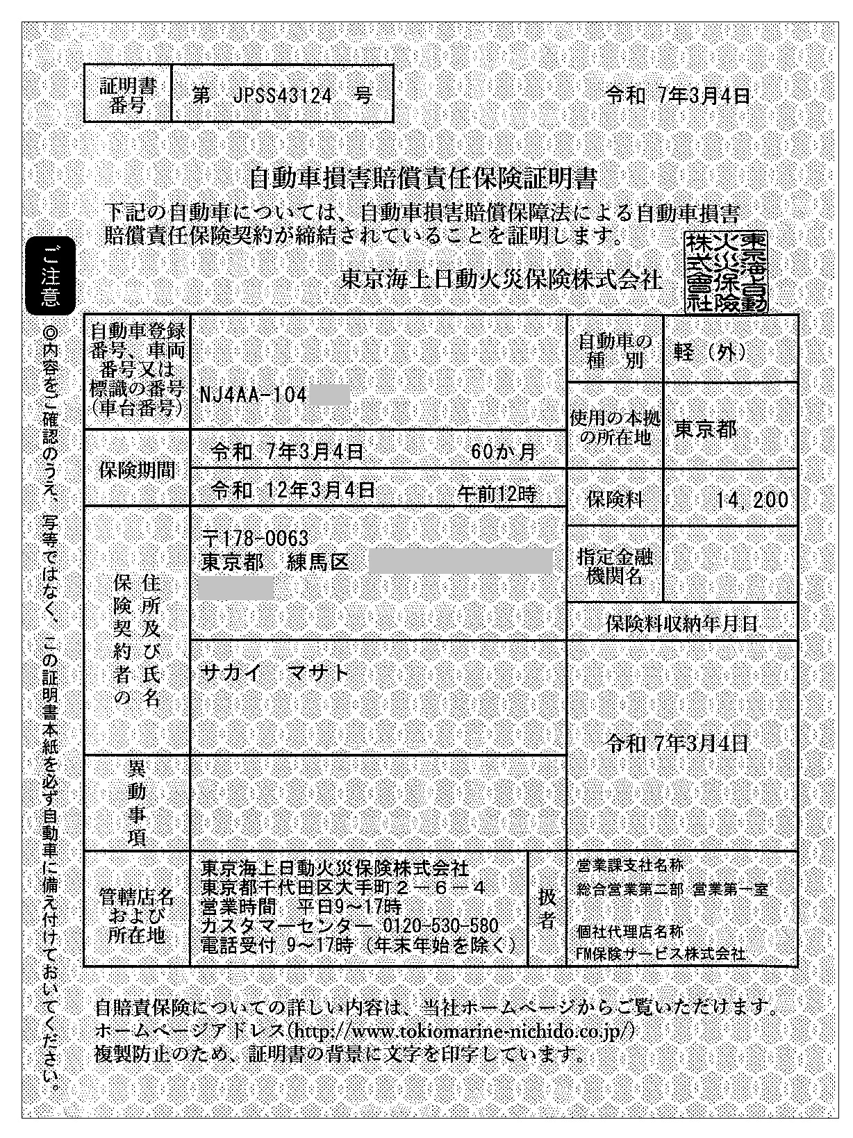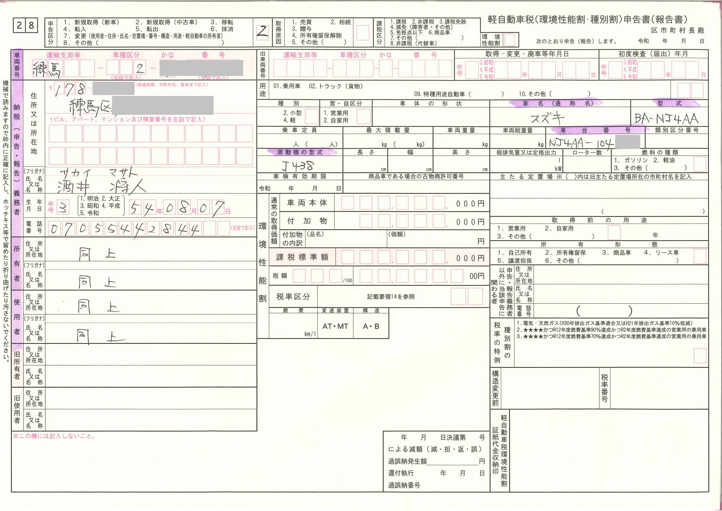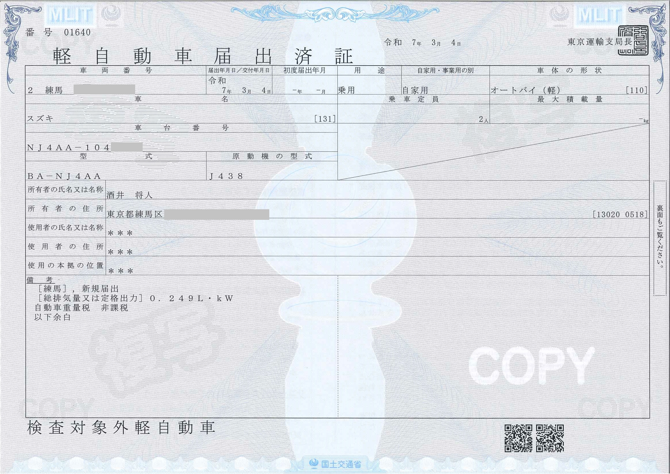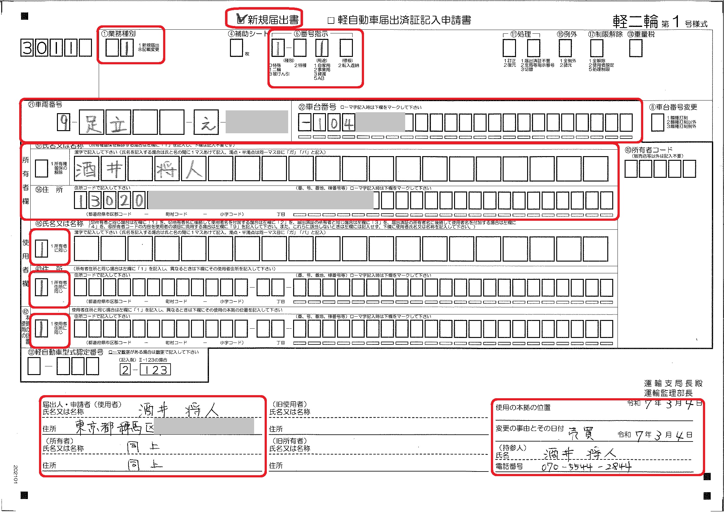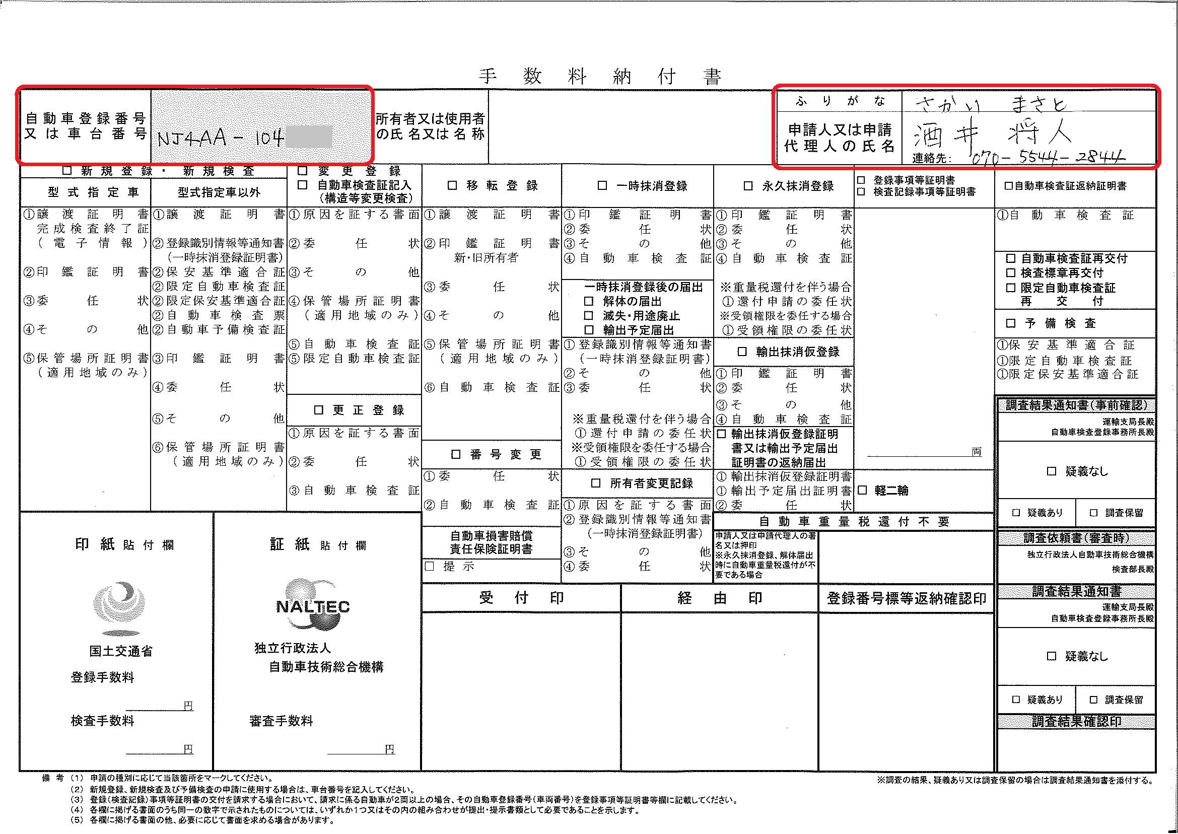 渡された書類(✅軽自動車税申告書)に必要事項を記入のうえ、ナンバー代(練馬ナンバーは530円)を支払うとナンバープレートが交付され、手続終了となります。