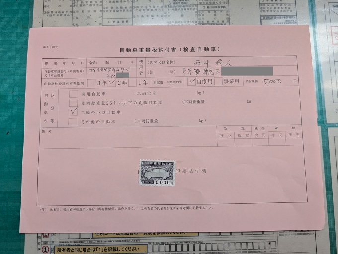 この重量税納付書には、印紙を買って(練馬陸運局の場合はB棟で)貼り付けておく必要があります。