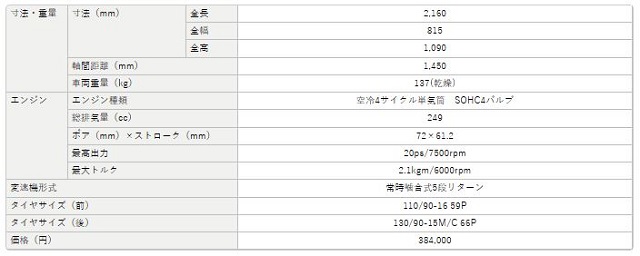アメリカンクルーザーの堂々とした外観や、ゆったりとした走り、乗りやすさなどが気軽に味わえる250cc(125cc)のクルーザー。クラスを越えた存在感を持つ、低く長いアメリカンクルーザーならではのスタイルを採用した大柄な車体に、クロームメッキや金属パーツを多用し質感の高い仕上げとした。軽量・シンプルで信頼性・経済性の高い250cc(125cc)4サイクル単気筒SOHCエンジンを搭載した。